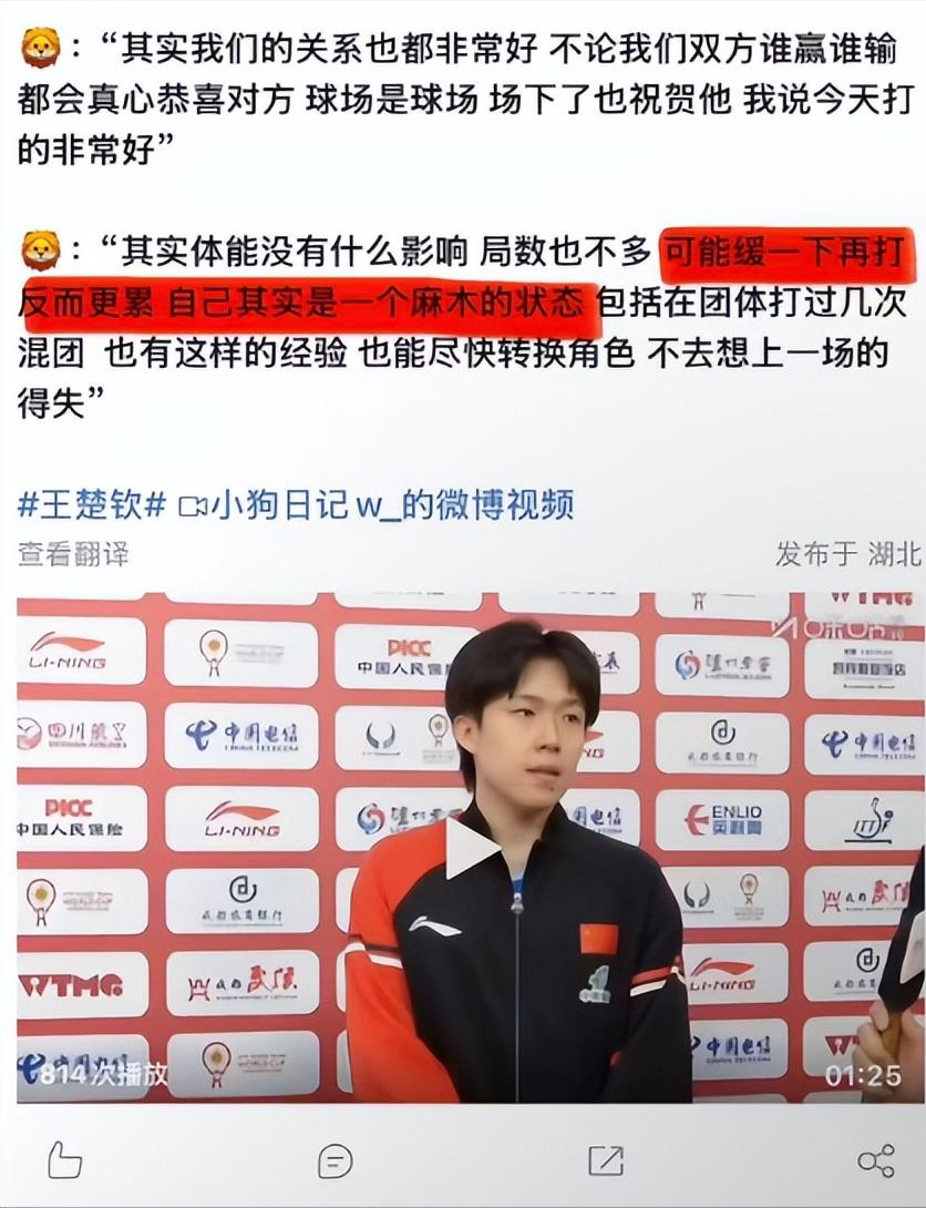 在昨日比赛结束后的采访中,王楚钦罕见的表示自己确实太累了。