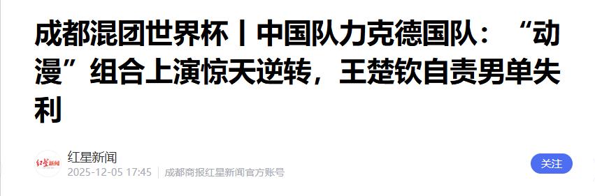 这场比赛也是王楚钦在混团开赛以来第一次输球。