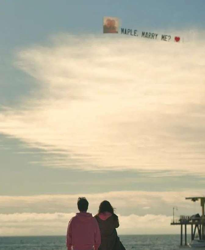 男主角不仅包下私人飞机在空中拉出巨型求婚横幅,还上演了“求婚成功秒换婚纱”的偶像剧名场面。