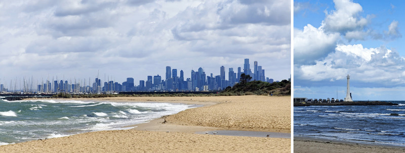 左:在海滩上望见墨尔本的天际线 右:栈桥和灯塔也是海滩的标志之一