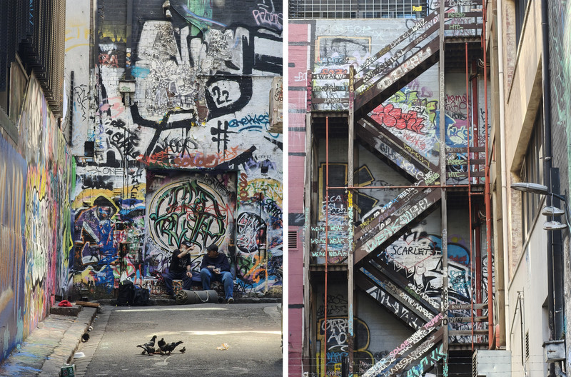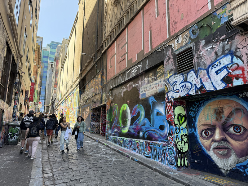 1.1.1 打卡第一站:墨尔本涂鸦街(Hosier Lane),这是墨尔本市中心联邦广场附近的一条普通的小巷,只因整条巷子的每一个角落——甚至连街角的垃圾桶都不放过——都被画满了各种涂鸦,成了热门的网红打卡地。