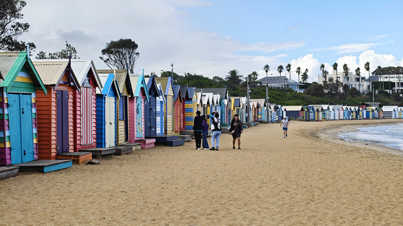 1.3.2 墨尔本市区南边是菲利普港湾,海湾东岸是长长的沙滩,其中布赖顿海滩(Brighton beach)是著名的休闲海滩之一,海滩上五颜六色的小木屋是它标志性的景观。
