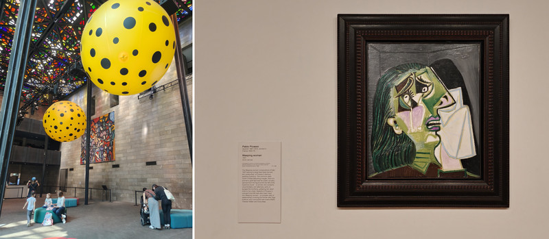 左:美术馆大厅的彩色玻璃天花板,以及草间弥生风格的气球 右:毕加索《哭泣的女人》是诸多镇馆之宝中的一件