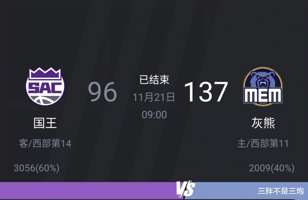 国王:全队96分、总命中率46.3% 、三分命中率33.3%