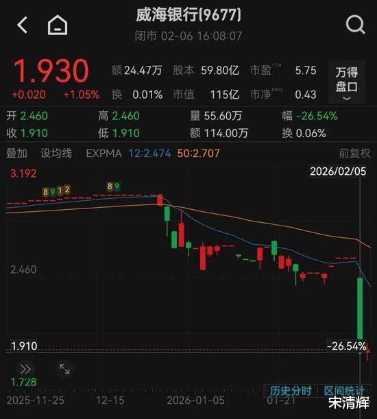 2026年2月5日,当A股银行板块整体反弹之际,威海银行却遭遇了一场罕见的暴跌。股价单日下跌26.54%,收盘报1.91港元,创下该行自2020年上市以来的最低水平。