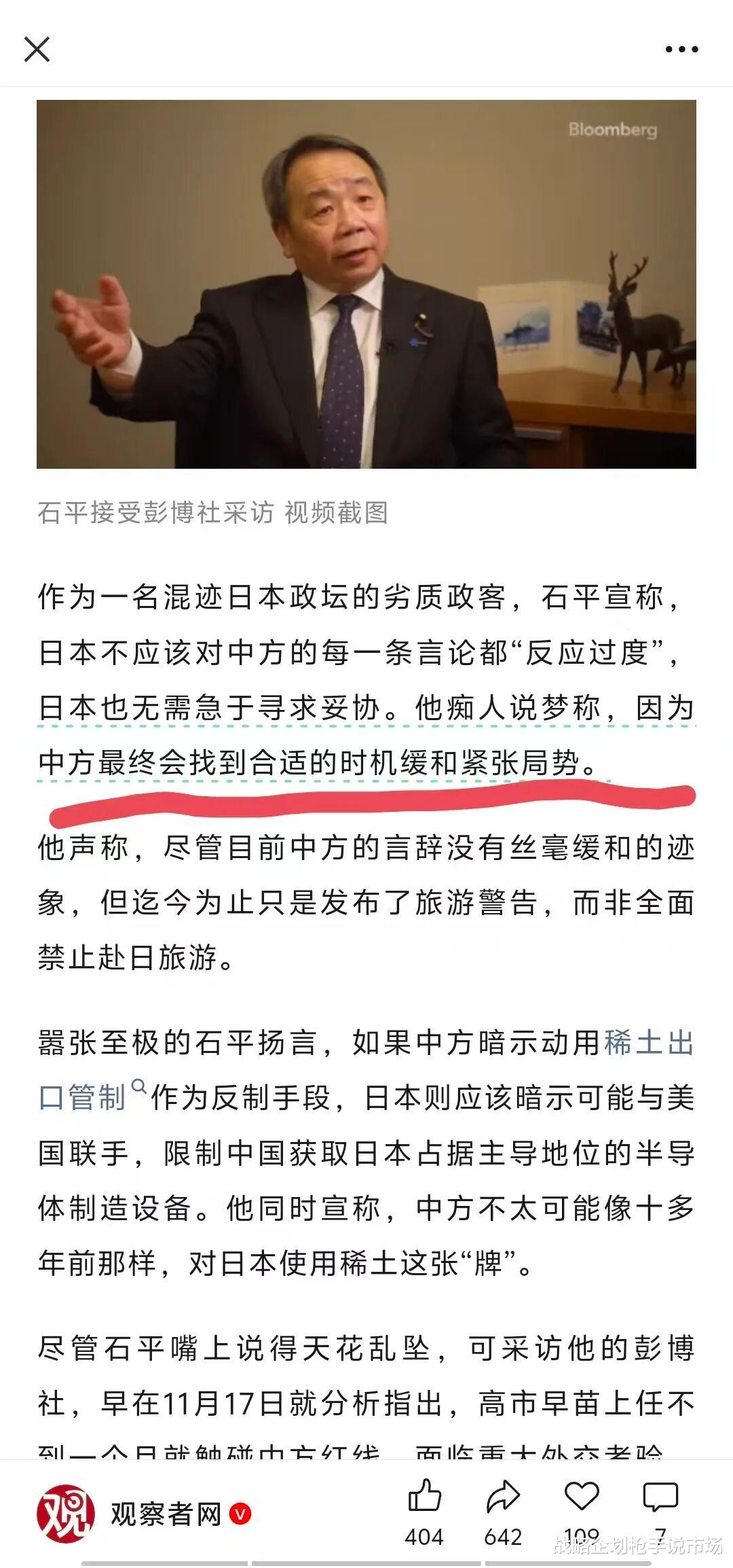 11月20日,汉J石平在接受彭博社采访的时候宣称:日本不必对中国方面的言论都反应过度,日本无需急于寻求妥协,因为中方最终会找到合适的时机缓和紧张局势!