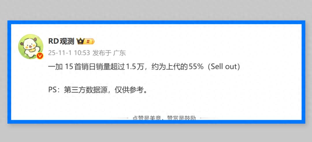 前几天发的文章还有人和我杠(也不知道是不是一加水军),这不今天关于一加15的首销数据就出来了——“首日销量1.5万台,约为前代的55%”。(数据源自RD观测)