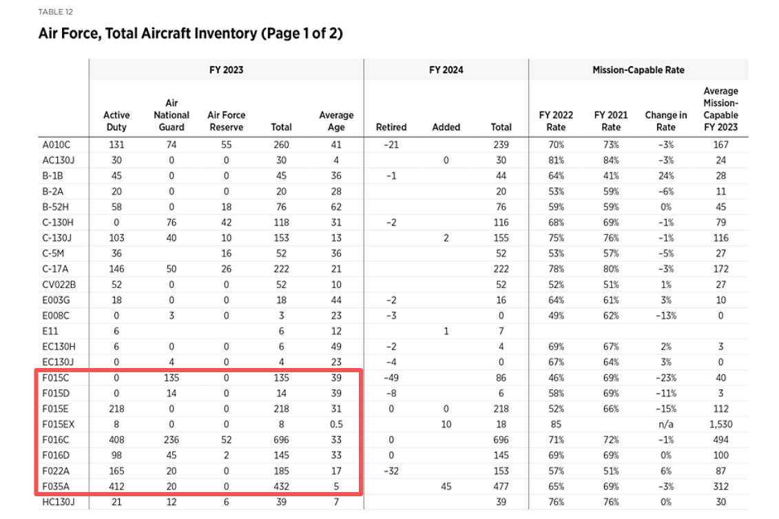 2024财年美国空军战机数量与战斗机平均服役时间