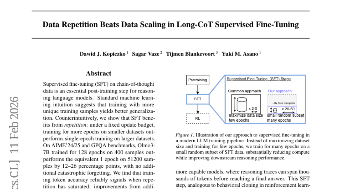 研究团队专门研究了一种叫做"有监督微调"的AI训练方法,这就像是在AI已经掌握了基础知识后,专门教它如何进行复杂的数学推理。他们发现,与其让AI学习大量不同的推理案例,不如让它在相同的案例上反复练习更多轮次。这种"重复学习"的效果好得令人惊讶——在相同的训练时间内,反复练习400个样本128轮的AI模型,竟然比只练习51200个不同样本1轮的模型表现好12-26个百分点。