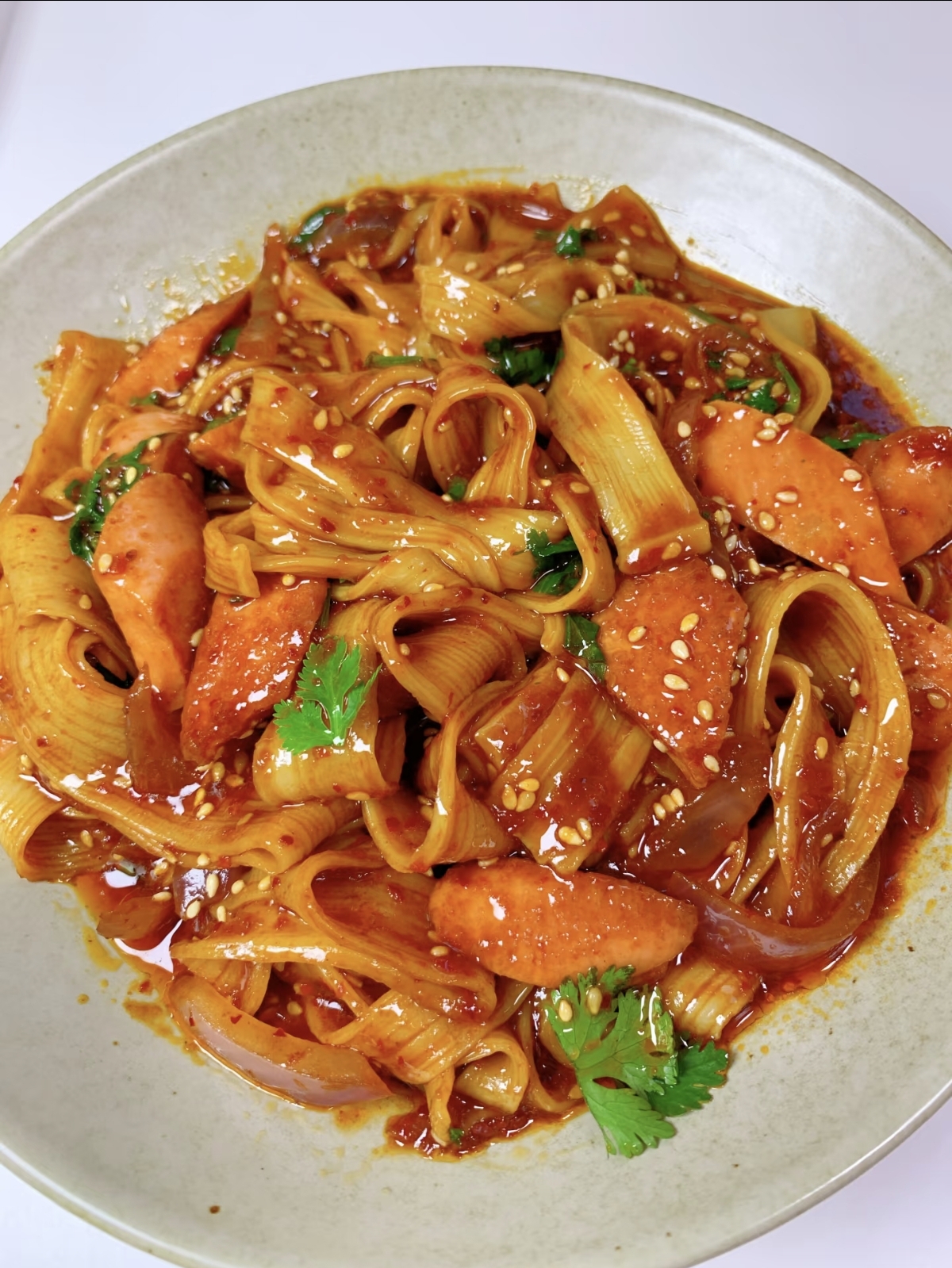 最关键的一步,是调制那碗秘制酱汁。取一个小碗,加入两勺蒜蓉辣酱,一勺蚝油提鲜,一勺番茄酱增加一丝微妙的酸甜,再淋入少许陈醋和半勺老抽,加入少量清水搅拌均匀。将这碗酱汁倒入锅中,与面条、火腿和配菜一同快速翻炒。酱汁遇热,“滋啦”一声,香气瞬间爆发,紧紧地包裹住每一根面条和配料,让它们色泽红亮,诱人至极。