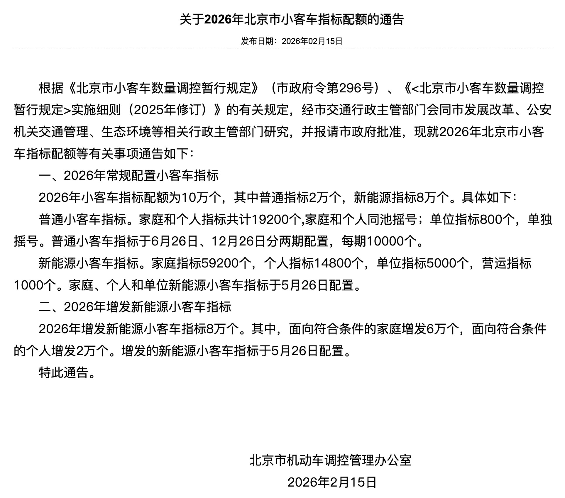 2026年2月15日,北京市机动车调控管理办公室发布《关于2026年北京市小客车指标配额的通告》,常规指标配额总计10万个;增发8万新能源指标。