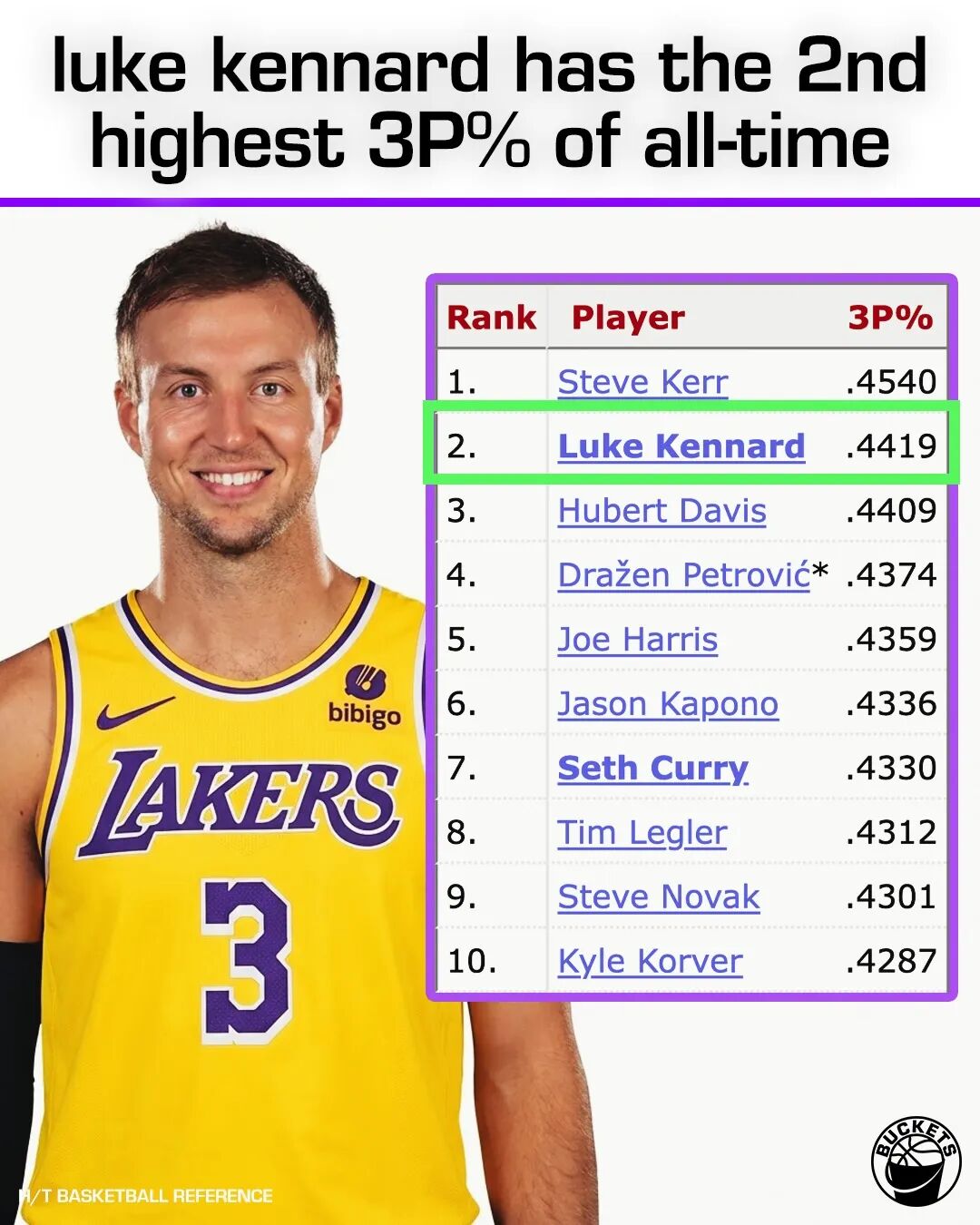 2、肯纳德的三分能保持稳定吗?要知道,湖人可是知名的“射手墓场”,很多射手到了湖人之后都出现了下滑,上一个还是比斯利,湖人期间三分35.3%,一离开湖人就立马回到41.6%,希望肯纳德能稳住