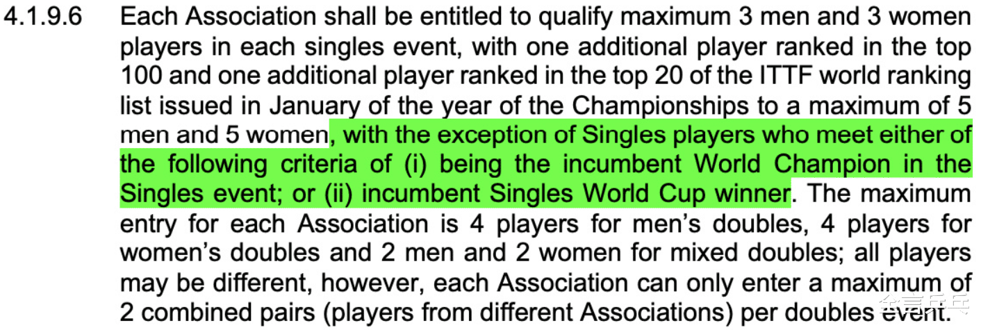 关注乒坛的朋友们都知道,世界锦标赛近十余年来的单打名额规则比较固定,每个协会最多5男5女、总计10人参加,像中日这样的强队通常都能满额出战,如果是东道主的话可能会额外增加男、女各1人,但超过10人的情况并不多见。