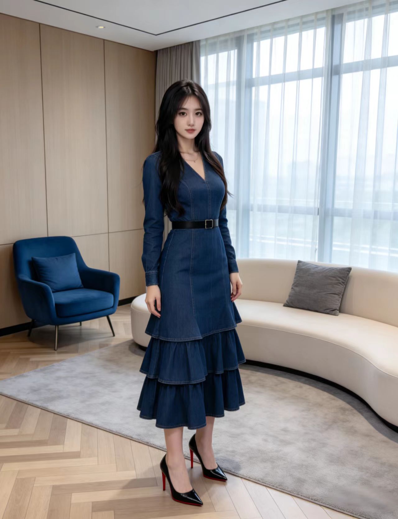 深蓝色牛仔质感长袖连衣裙,清新又温柔,上班穿如何?