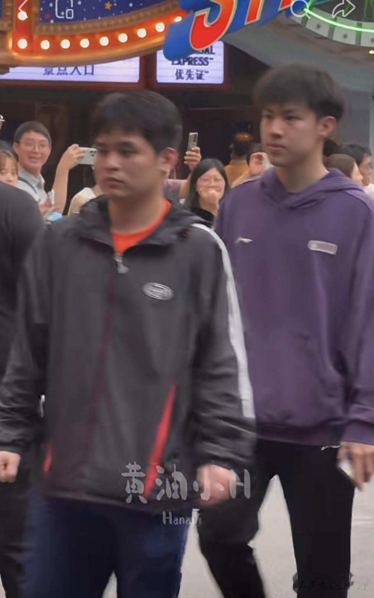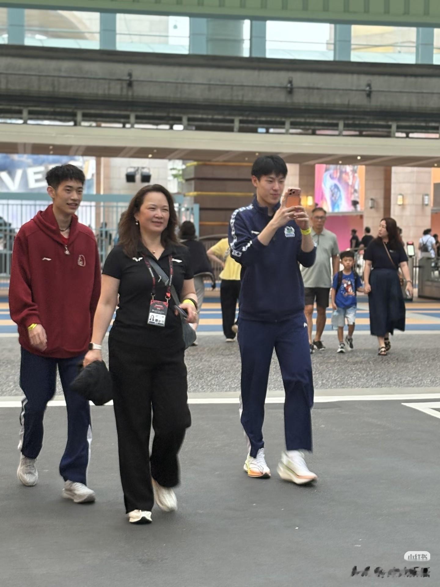后面看到又来了很多人,周启豪这身衣服搭配的很帅啊,陈垣宇咋还偷着乐呢。石洵瑶和覃予萱走在前面,王楚钦穿了一件防晒衣来了,这次的发型确实好看,看着就很青春,周启豪后面是佳佳。
