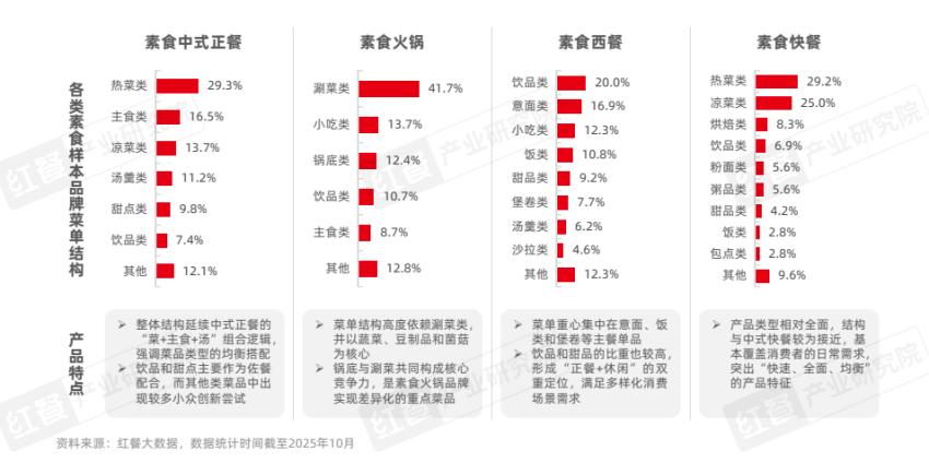 与此同时,新派素食品牌的产品结构也呈现出差异化逻辑。比如,中式素食正餐注重均衡与传统一体化,素食火锅突出涮菜核心与锅底创新,素食西餐强调“主餐+休闲”的复合定位,而素食快餐则以“快、全、均衡”为特征覆盖多场景需求。这些不同素食细分类型的餐厅,既保留各自的餐饮逻辑,又共同体现出素食理念在产品结构上的创新和细分化发展特征。