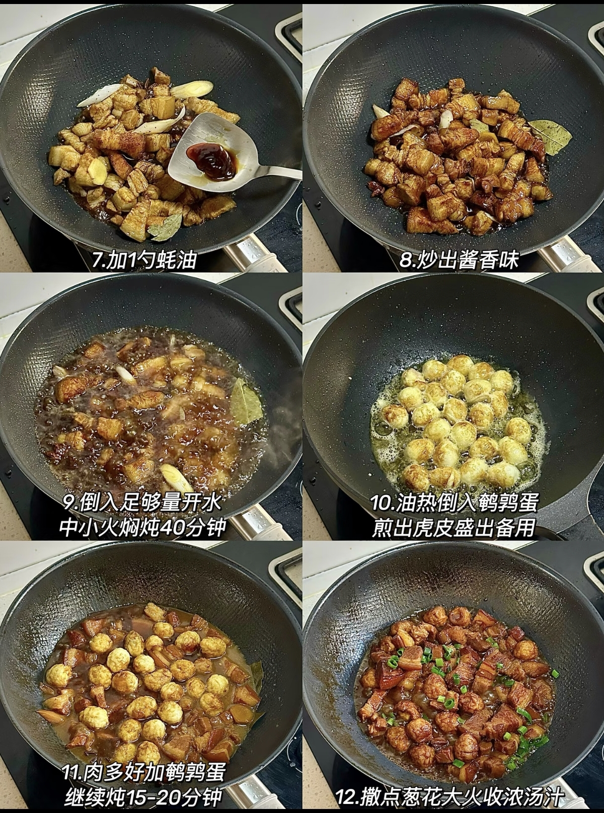 做这道菜,食材的选择是关键。我特意挑选了肥瘦相间的五花肉,这种肉层次分明,炖出来既不会柴也不会腻。先把五花肉洗净,切成大小均匀的方块,冷水下锅焯水,加入几片姜和少许料酒,煮开后撇去浮沫,捞出沥干水分。这一步是为了去除肉里的腥味和多余的油脂,让成品口感更佳。接着,就是处理配角——鹌鹑蛋。我准备了十几颗新鲜的鹌鹑蛋,冷水下锅煮熟,捞出后迅速放入冷水中浸泡,这样剥壳的时候会格外轻松,剥出来的蛋圆润光滑,像一颗颗白玉珠子,待会儿炖煮时能更好地吸收肉的香味。