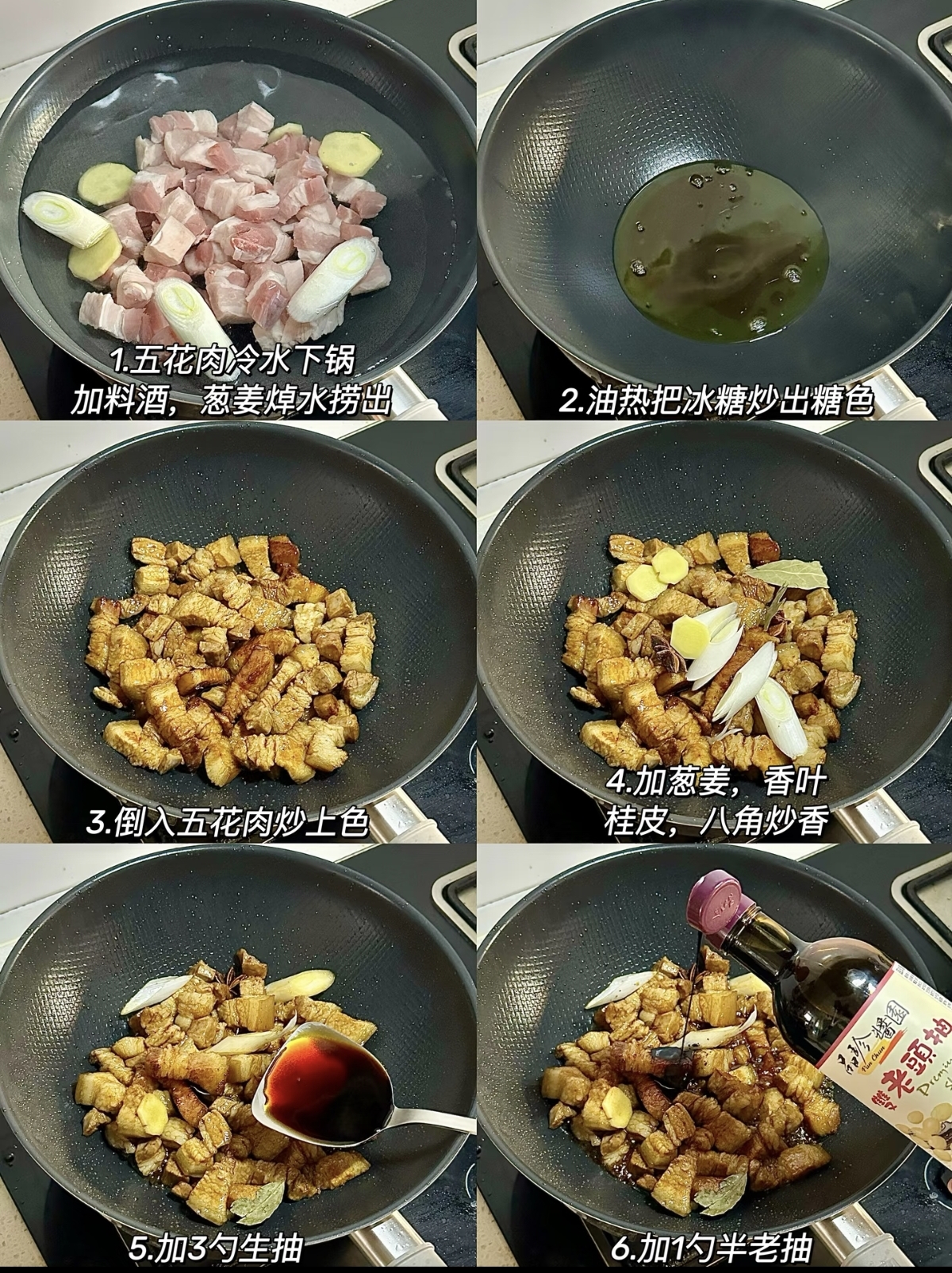 重头戏来了,那就是炒糖色。这可是决定红烧肉颜值和味道的灵魂一步。锅中放少许油,加入适量的冰糖,开小火慢慢翻炒。看着冰糖在锅中慢慢融化,由白色变成琥珀色,再变成枣红色,同时冒起细密的小泡,这时候要迅速倒入开水,瞬间“刺啦”一声,香气扑鼻而来,一锅金黄透亮的糖色水就做好了。把焯好水的五花肉倒进锅里,翻炒至每块肉都均匀裹上糖色,再加入生抽、老抽、蚝油、料酒,以及八角、桂皮、香叶等香料,继续翻炒出浓郁的香味。