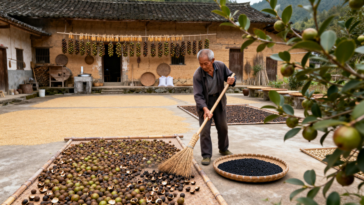 茶果采回后需晾晒7-10天,待外壳自然裂开。工人用竹帚扫去果壳(称“茶蒲”),留下乌黑茶籽。清代《永州府志》载:“曝之使坼,簸扬去壳,得仁如墨玉。”这些“墨玉”需再经石碾破壳,筛出完整茶仁——破损籽易氧化,影响油品。