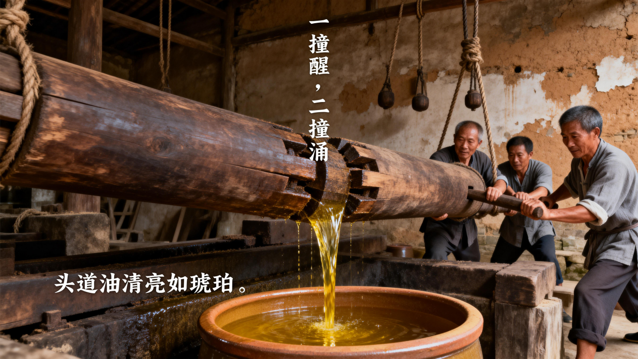 在没有电力和现代机械的古代,中国人如何从坚硬如石的油茶籽中提取清亮油脂?明代科学家宋应星在1637年完成的《天工开物·膏液篇》中,给出了系统而准确的记录。这套被称为“木榨法”的工艺,是中国古代油脂加工技术的集大成者,其核心原理是纯物理压榨,全程不使用化学溶剂,依靠人力与木质机械结构实现高效出油。古法榨油,是中国农耕文明最精妙的物理工程之一。整套流程无需电力、不用化学溶剂,仅凭人力、水力与木石之力,从坚硬如石的茶籽中提取清亮油脂。其核心工艺可概括为“五步九诀”: