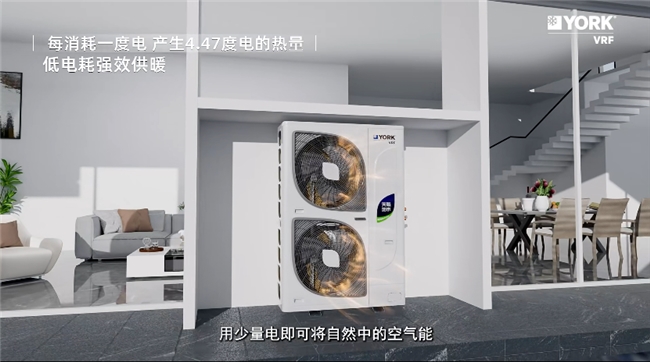 其硬核性能始于核心部件的严苛配置:使用约克品牌热泵采暖专用喷气增焓压缩机,搭载无级变频技术,实现-25℃~60℃宽温运行,动力强劲、运行稳定;同时搭载板式换热器中的“劳斯莱斯”——AlfaLaval板式换热器,确保卓越性能与无与伦比的舒适体验。更值得称道的是能效表现——约克VRF助推“双碳”目标实现,全系产品均达国标新一级能效标准。并且使用先进高效空气源热泵技术,地暖COP能效值至高可达4.47。这意味着,每消耗1度电可产生4.47度电热量。系统先从大自然中获取空气能,再以较少电能将其转为室内热量,减少用电成本,即使低温环境也可高效制热,长时间开地暖也无需担心电费超标。