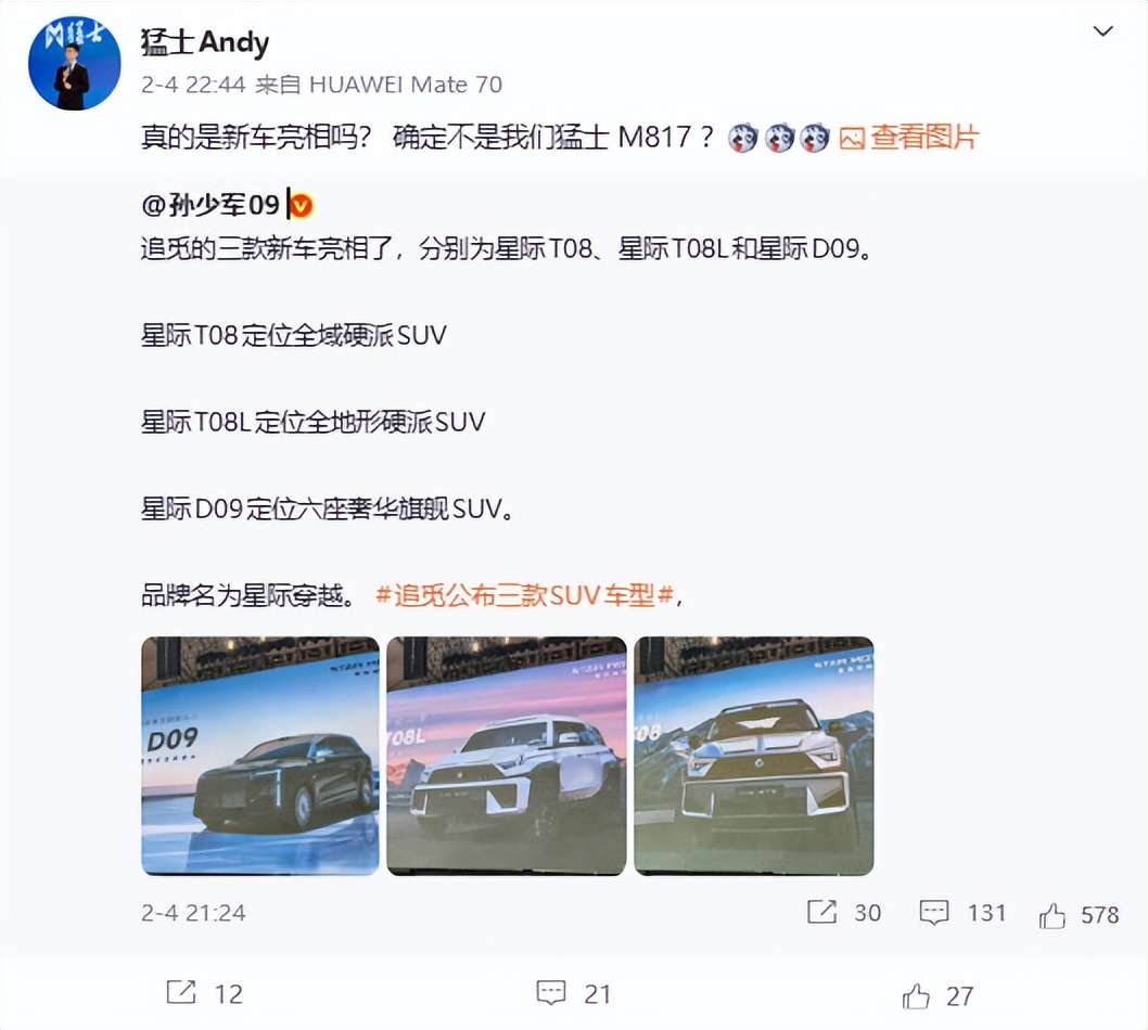 猛士这边的反应也是干脆利落,高管赵安直接在社交平台开怼,一句“真的是新车亮相吗?确定不是我们猛士M817?”配上“买正品认准东风猛士M817”的图,直接把“高仿”的标签钉在了追觅新车上。隔天又发了“请尊重原创”的海报,东风汽车官微也紧跟节奏喊出“真猛士无法被复制”。硬气的表态背后,是对原创设计的捍卫,更是对这种近乎照搬的造车方式的不屑。反观追觅,从2月4日发布会到8日,面对满屏的抄袭质疑,愣是没有一个官方声明,只让相关人士出来打太极,说星际穿越是追觅基金孵化的品牌,跟追觅没股权关系,用合作代工模式撇清关系,这波操作,属实显得心虚。