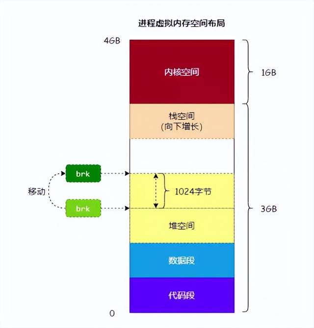 所以,通过移动 brk 指针就可以达到申请(向上移动)和释放(向下移动)堆空间的内存。例如申请 1024 字节时,只需要把 brk 向上移动 1024 字节即可,如图所示:
