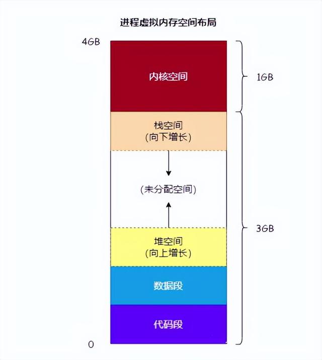 物理内存:也就是安装在计算机中的内存条,比如安装了 2GB 大小的内存条,那么物理内存地址的范围就是 0 ~ 2GB。虚拟内存:虚拟的内存地址。由于 CPU 只能使用物理内存地址,所以需要将虚拟内存地址转换为物理内存地址才能被 CPU 使用,这个转换过程由 MMU(Memory Management Unit,内存管理单元) 来完成。虚拟内存 大小不受 物理内存 大小的限制,在 32 位的操作系统中,每个进程的虚拟内存空间大小为 0 ~ 4GB。程序中使用的内存地址都是虚拟内存地址,也就是说,我们通过 malloc 函数申请的内存都是虚拟内存。实际上,内核会为每个进程管理其虚拟内存空间,并且会把虚拟内存空间划分为多个区域,如图所示: