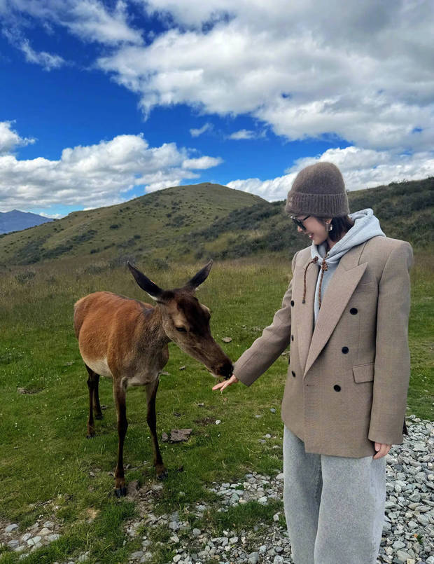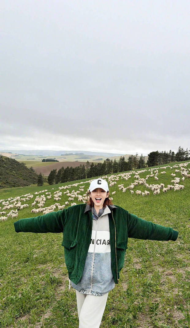 唐艺昕坐在长椅上欣赏美景,好惬意。