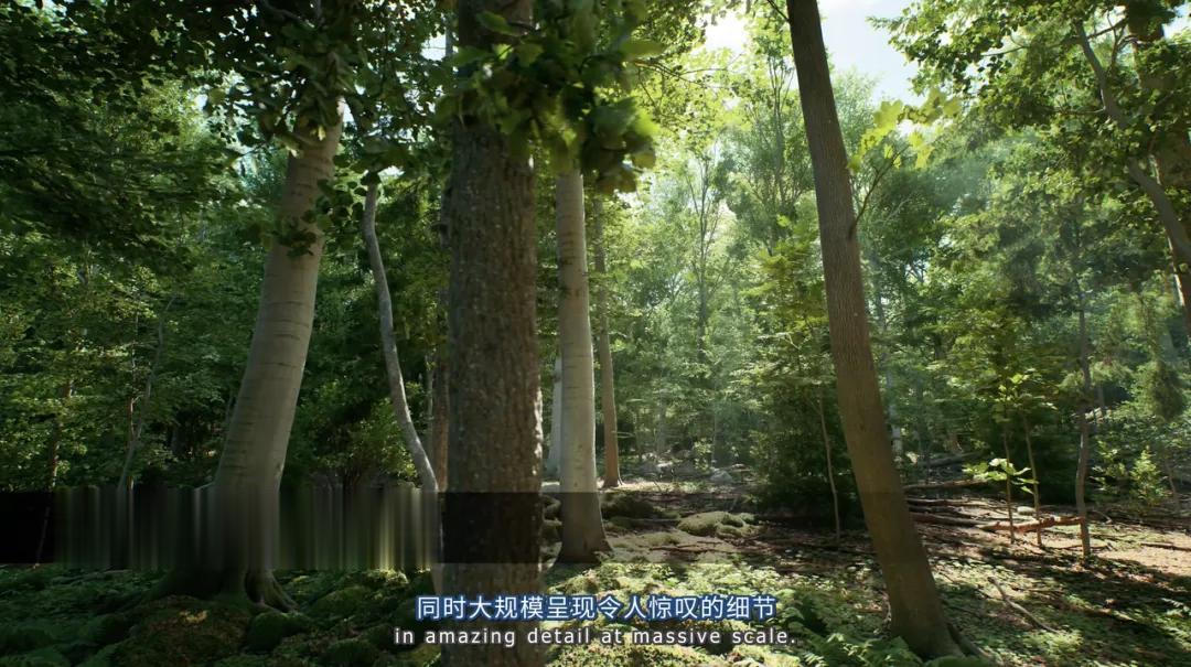 不过,在一款大世界中,开发者除了要生产大量资产,还要更高效地渲染整个世界。UE也想到了这一点,他们推出了一款实验性的Nanite植被几何渲染系统。它能在保证帧率的前提下,提升视野内的植被细节密度,降低优化成本。