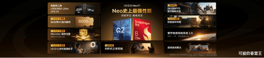 iQOO Neo11 搭载由骁龙 8 至尊版与自研电竞芯片 Q2 组成的“旗舰电竞双芯”,并在 Monster 超核引擎支撑下,带来优秀的 1% Low 帧表现、全新升级的 PC 级 2K 纹理超分、原生级 144FPS 无损超帧以及超分超帧并发,实现行业领先的游戏视效;更以 8K 冰穹 VC 液冷散热、7500mAh 超薄蓝海电池、AR 增透膜等多项 iQOO 15 同款配置、高质感金属玻璃机身和 IP68 & IP69 防尘防水等,共筑一款更优秀的强悍标准版。