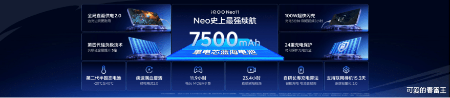 Neo11 实现 Neo 史上最强续航表现,搭载配备了第二代半固态电池技术和第四代硅负极技术的 7500mAh 超薄蓝海电池,即使在 -20℃ ~ 40℃ 的环境中,依然能稳定持久放电,并配备 100W 超快闪充且支持 PPS 和 PD 快充协议,让充电更自在;全新升级的全局直驱供电 2.0,支持智能温控,做到发热更低、损耗更少,有效延缓电池老化,边充边玩也安心。
