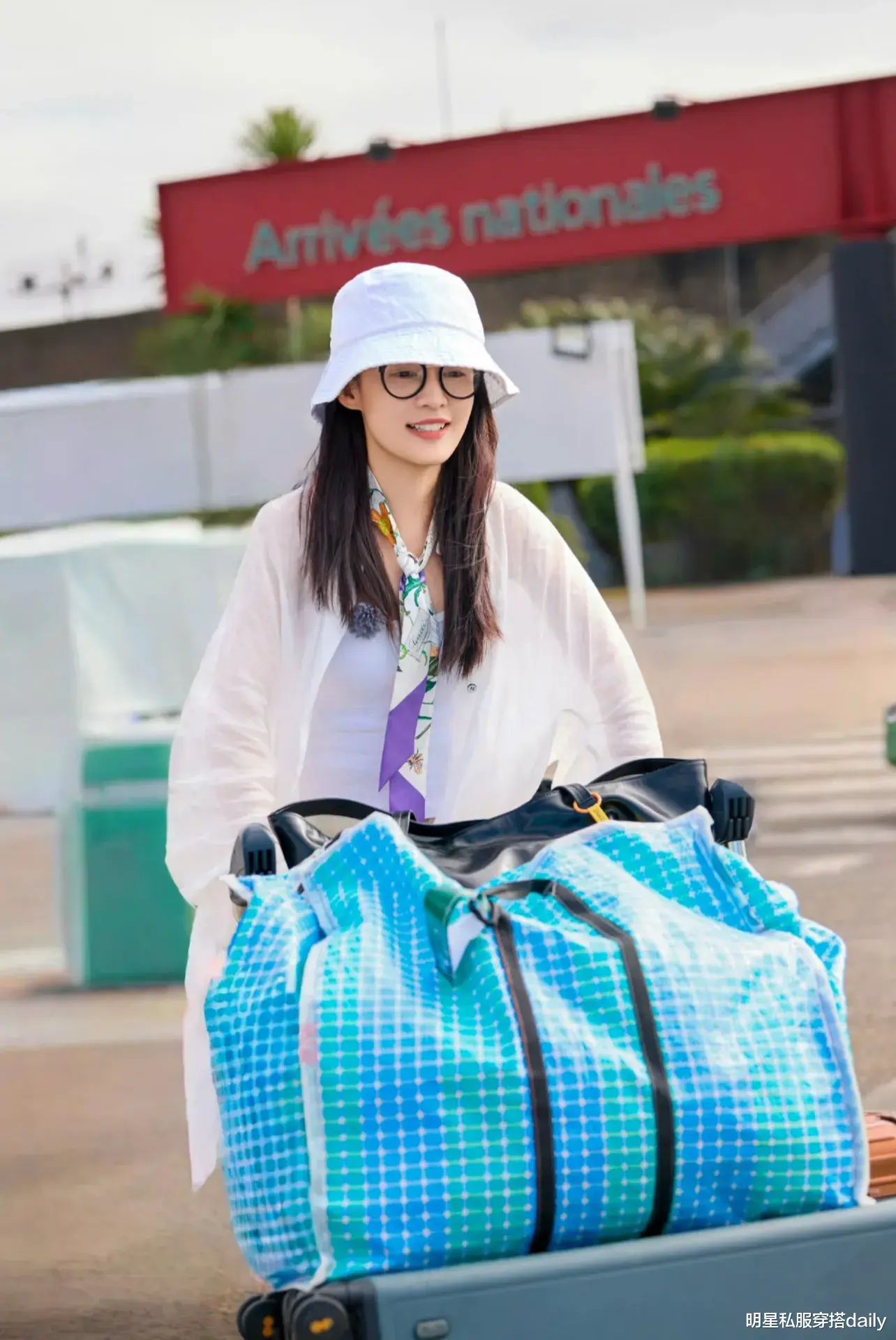 配饰方面,白色渔夫帽延续了整体的清新色调,实用又时尚;胸前系的紫色印花丝巾则是 “点睛之笔”,紫色的明艳与白色、印花裙形成鲜明对比,瞬间点亮整体造型,为慵懒度假风增添了几分精致与浪漫,让李沁仿佛从度假画报中走出,特别适合海边漫步、景区打卡等场景。