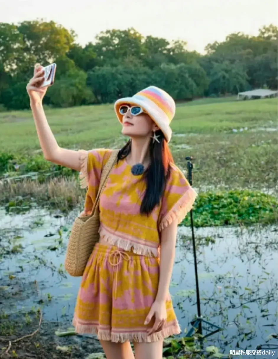 这套同色系套装,用色彩传递出满满的度假活力与治愈感。李沁身穿的芥末黄色流苏短袖上衣 + 同色系抽绳短裤,整套造型色彩明艳却不刺眼,芥末黄色自带温暖滤镜,特别适合秋日或热带地区的旅途,能瞬间在人群中脱颖而出;抽绳短裤则兼具舒适度与实用性,抽绳设计可自由调节松紧,适配不同身材,露出纤细腰线,尽显少女感。