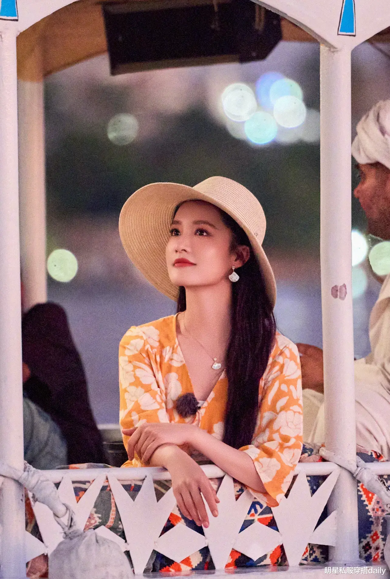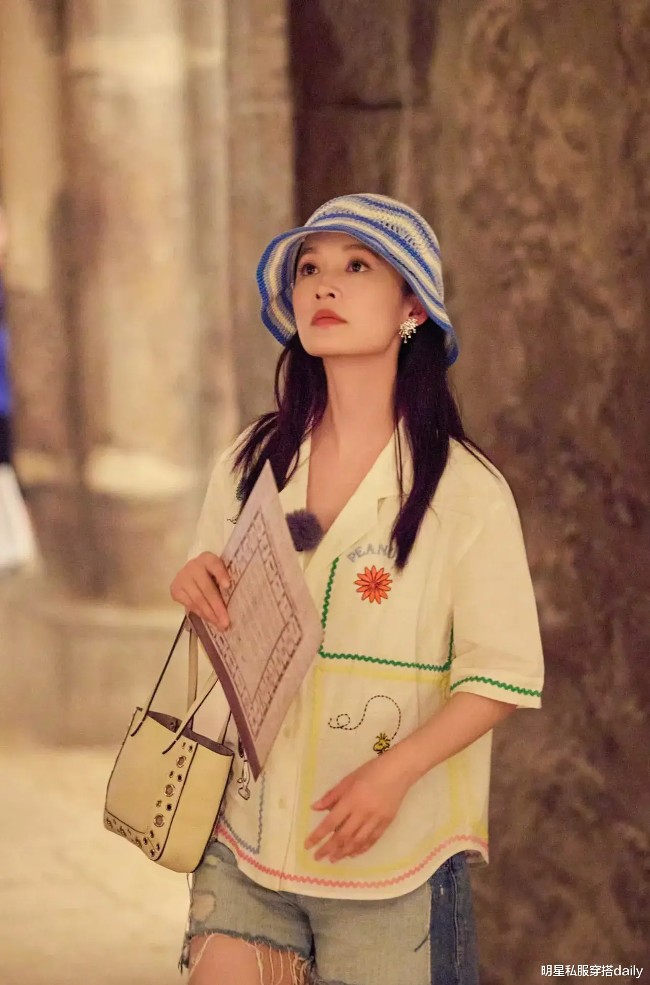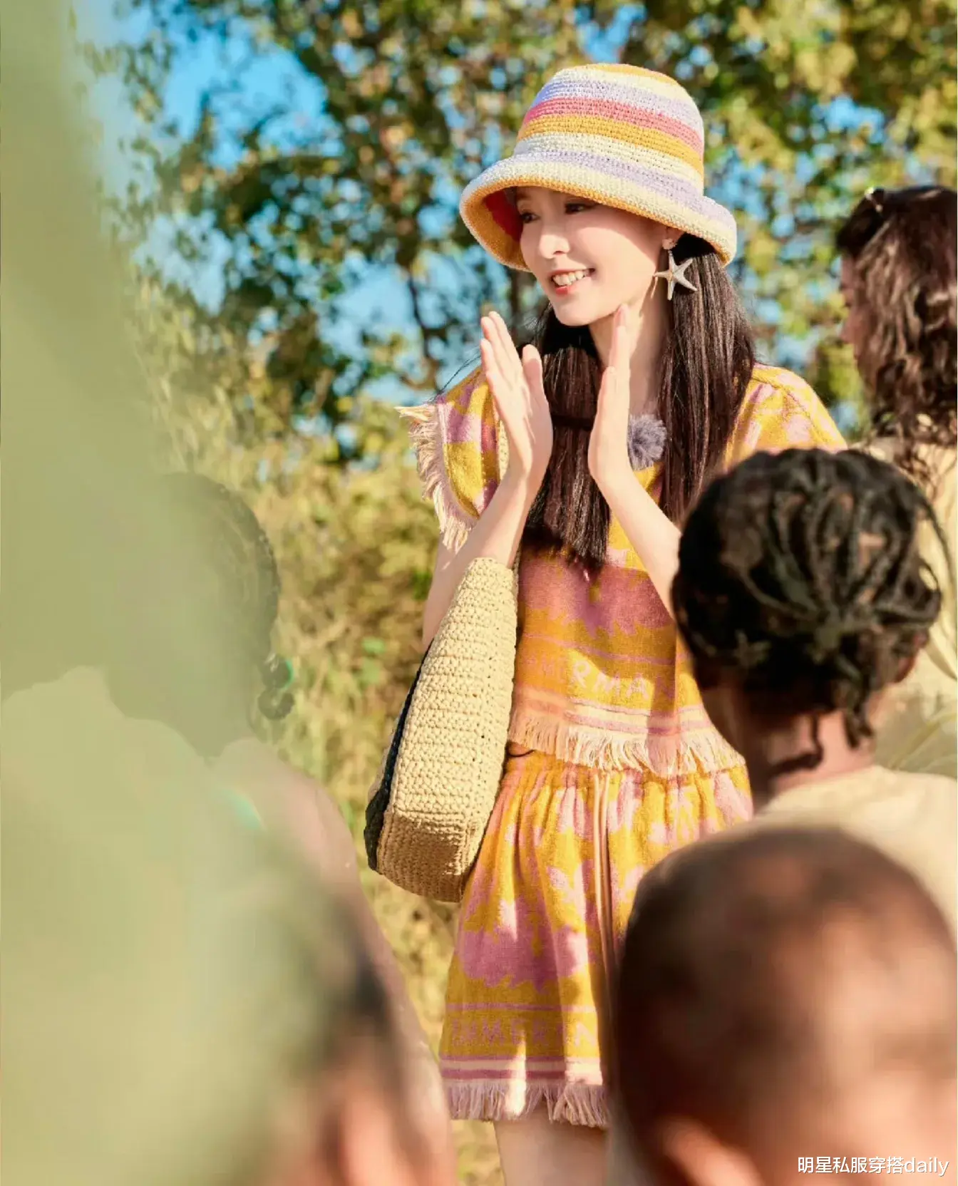 搭配的黄色条纹渔夫帽与套装颜色相呼应,强化了同色系穿搭的和谐感;编织包则是度假风的 “标配”,天然的编织材质与明艳的黄色形成对比,既增添了几分自然气息,又与度假氛围完美契合,让李沁看起来清新又治愈,充满阳光活力。
