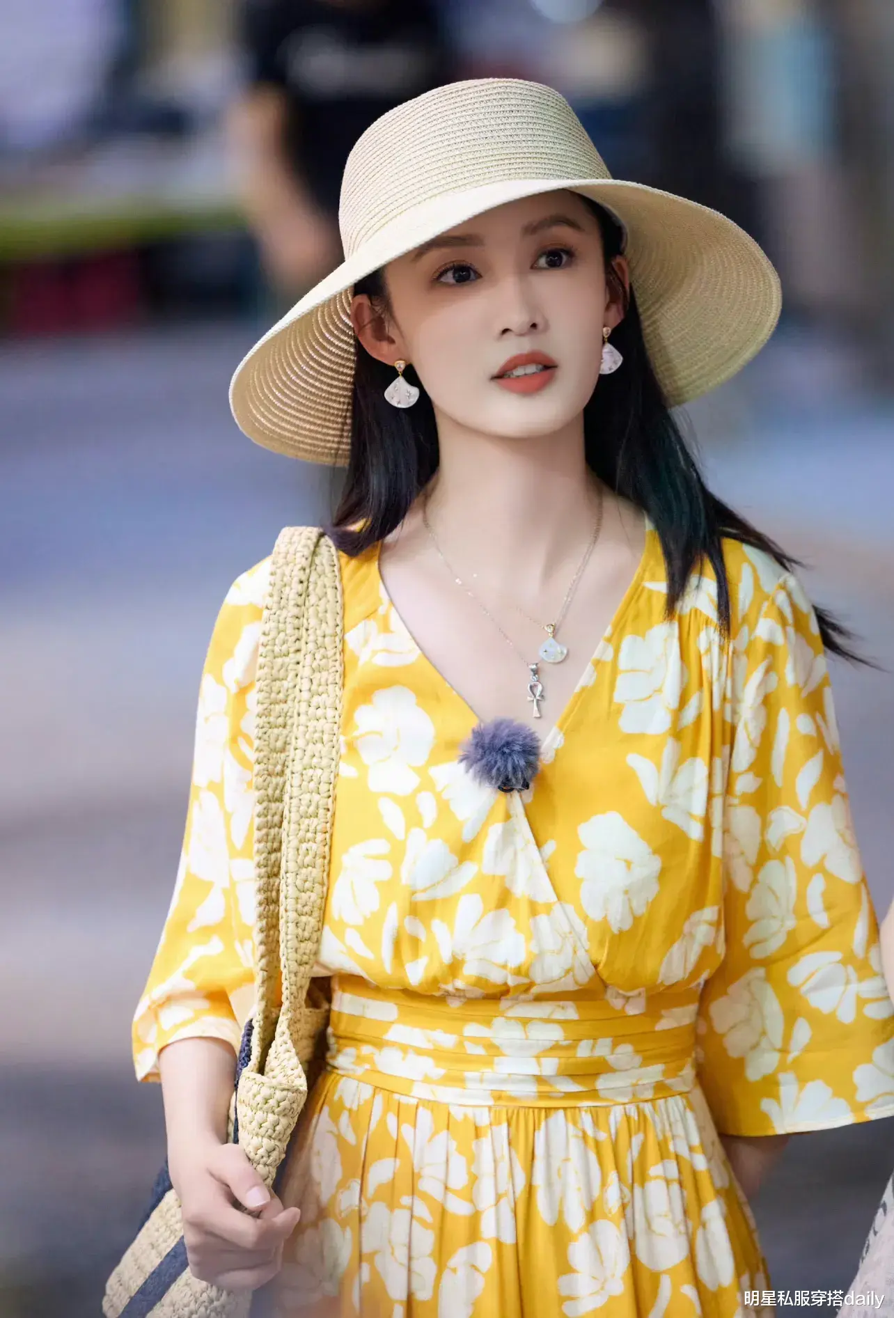 茶歇裙本身就是法式优雅的代名词,这套造型更是将这份温柔发挥到极致。李沁身穿的黄色印花 v 领茶歇连衣裙,黄色底色明亮温暖,印花图案精致浪漫,尽显女性柔美;v 领设计巧妙拉长颈部线条,露出纤细锁骨,增添了几分小性感;茶歇裙的版型宽松却不失曲线感,腰间的收腰设计能勾勒出腰身,对各种身材都十分友好,行走间裙摆飘动,尽显优雅灵动。