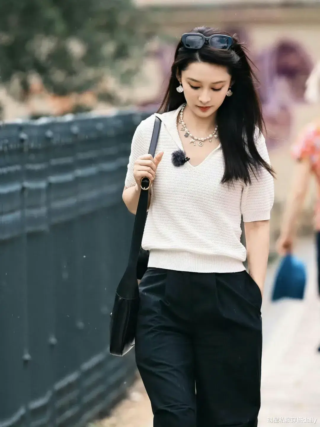 “越简单越好看” 的穿搭真理,在这套造型中体现得淋漓尽致。李沁上身的米白色针织 Polo 短袖,法式感十足,柔软的针织材质贴合身形却不紧绷,尽显温柔气质;Polo 领设计经典又显利落,比普通圆领多了几分精致感,米白色则自带柔和滤镜,衬得人肤色更显通透。下半身搭配的黑色休闲裤,与米白色形成经典的黑白配,简约却极具高级感,休闲裤的版型宽松舒适,对身材包容性强,行走间尽显自在。