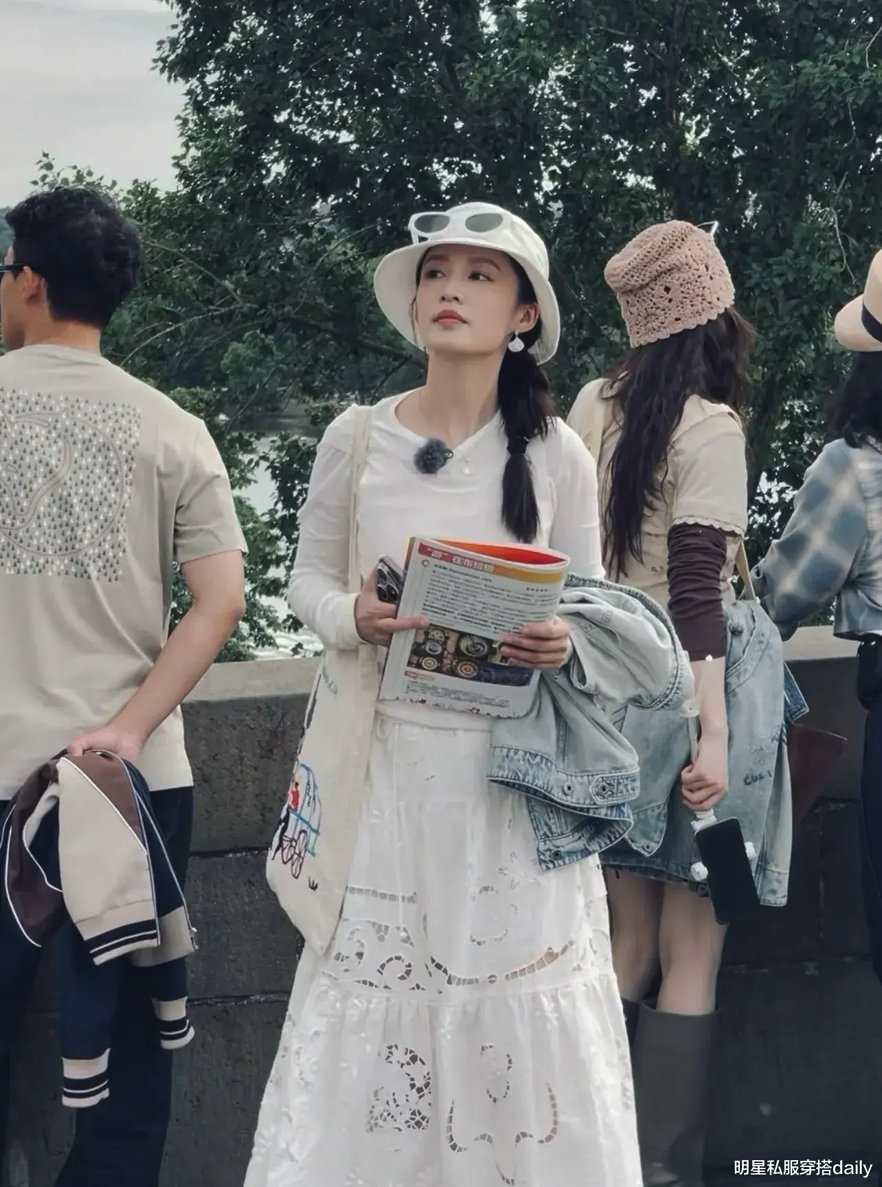 下半身的白色蕾丝半身长裙是 “甜感” 的核心,蕾丝的浪漫柔美与牛仔马甲的酷帅形成强烈却和谐的对比,“上酷下甜” 的搭配既丰富了视觉层次,又尽显少女的灵动可爱。搭配的白色帆布包与厚底白色运动鞋,则延续了整体的清新色调,帆布包实用能装,厚底鞋显高又舒适,完美适配旅途行走需求,让李沁皮肤更显白皙,甜美元气扑面而来。