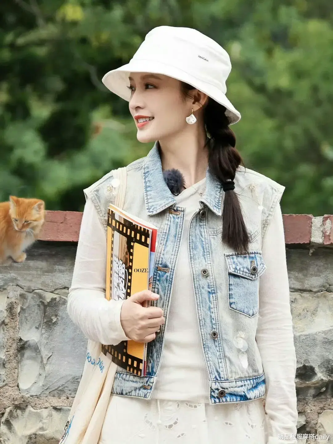 look2:复古工装牛仔马甲+白色蕾丝半身裙!甜酷混搭这套造型打破了风格界限,将工装风的酷与蕾丝的甜完美融合,展现出李沁时尚搭配的巧思。上身的复古工装风牛仔马甲背心,自带复古街头感,硬朗的牛仔材质与工装版型尽显利落;而马甲上点缀的水钻和亮片则格外 “重工”,瞬间为工装风注入精致感,让硬朗的马甲多了几分闪耀与柔美,避免了风格的单一性。内搭的米白色长袖 T 恤,柔和了牛仔马甲的硬朗,透视细节增添了几分小性感,又不会过于暴露,分寸感恰到好处。