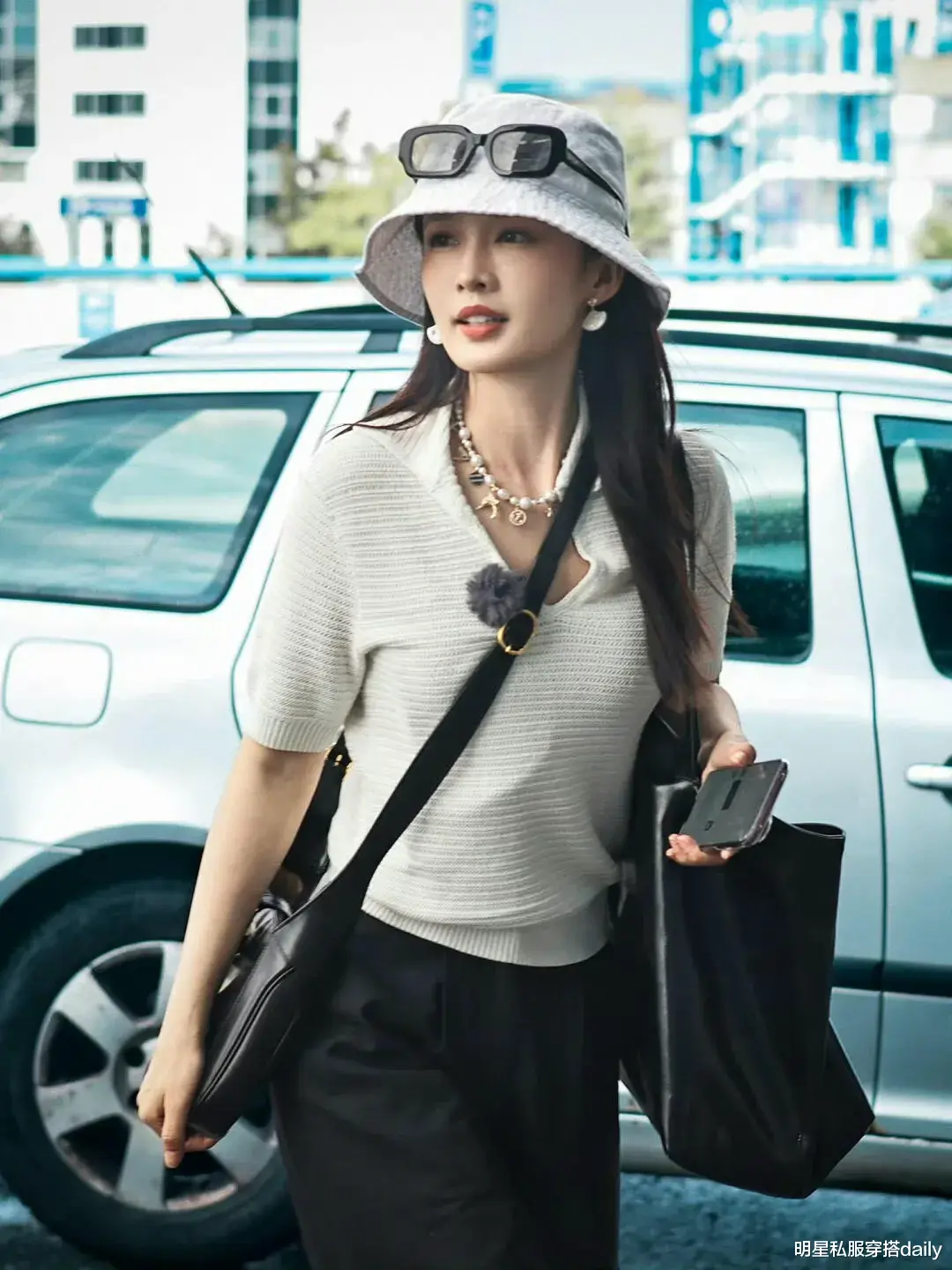 配饰上,米白色渔夫帽与上衣颜色相呼应,形成色彩闭环,让整体造型更显和谐统一;而存在感明显的珍珠项链则是整套造型的 “亮点担当”,珍珠元素的优雅温润打破了黑白搭配的沉闷,为简约造型注入精致感,既不会过于夸张,又能瞬间提升时尚度,让李沁在简约穿搭中依旧亮眼,特别适合旅途中餐、休闲座谈等偏正式却不严肃的场合。