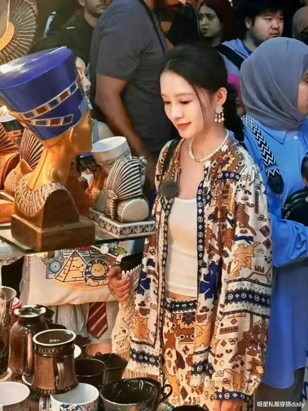 这套造型将 “休闲” 与 “浪漫” 结合,完美诠释了度假氛围。李沁上身的白色透视感宽松衬衫,自带慵懒随性的气息,透视材质朦胧又显温柔,宽松版型则尽显自在;内搭的白色运动背心,既保证了穿着的舒适度与得体性,又与衬衫形成 “叠穿层次感”,避免了透视衬衫的单调。下半身的印花迷笛半身长裙,印花图案鲜活亮眼,充满度假风情。