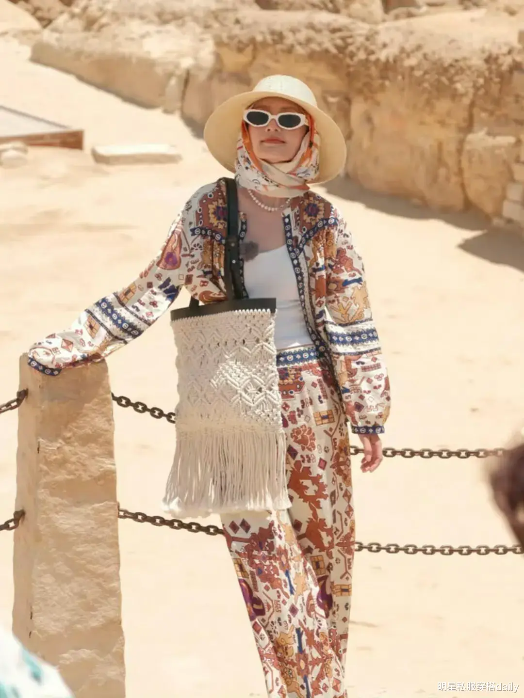 搭配的流苏包包极具特色,流苏细节与印花的灵动相契合,为整体造型增添了几分复古潮流感,让李沁的法式度假风更具完整性,氛围感十足。