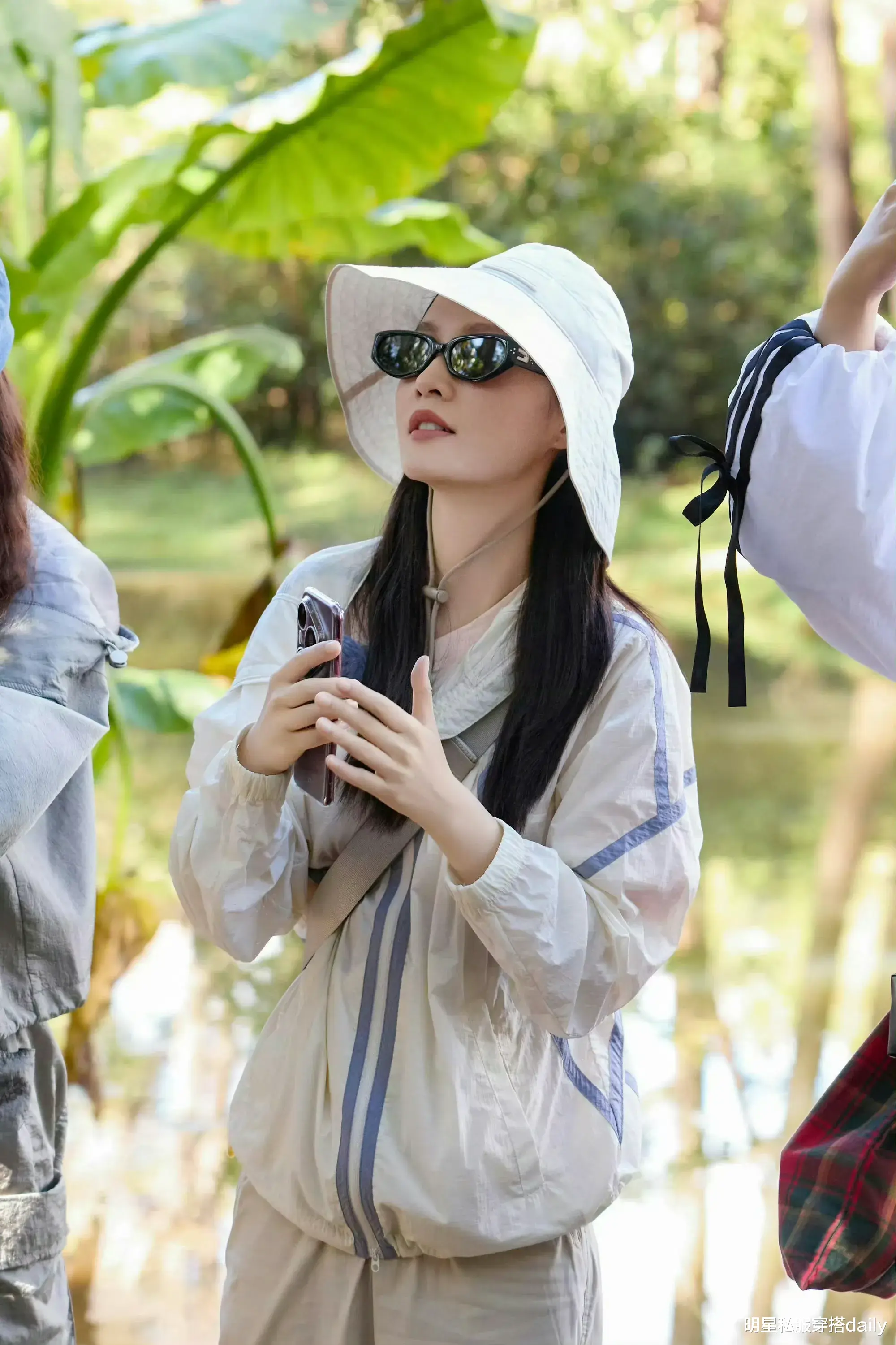 这套造型兼顾了户外场景的实用性与时尚感,打破了 “户外装必臃肿” 的刻板印象。李沁上身的米白色机能防紫外线外套,超薄材质轻便不厚重,既能抵御户外紫外线,又不会显得臃肿;机能风的设计自带利落感,简约的米白色则避免了户外装常见的深色沉闷,让户外造型更显亮眼。