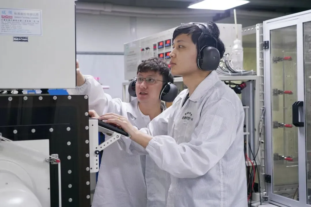 马小广(右)在做风扇扇叶高性能材料分析研究。
