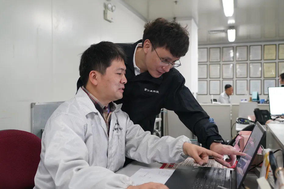 马小广(右)与团队成员核查散热风扇性能参数,研讨如何改进。