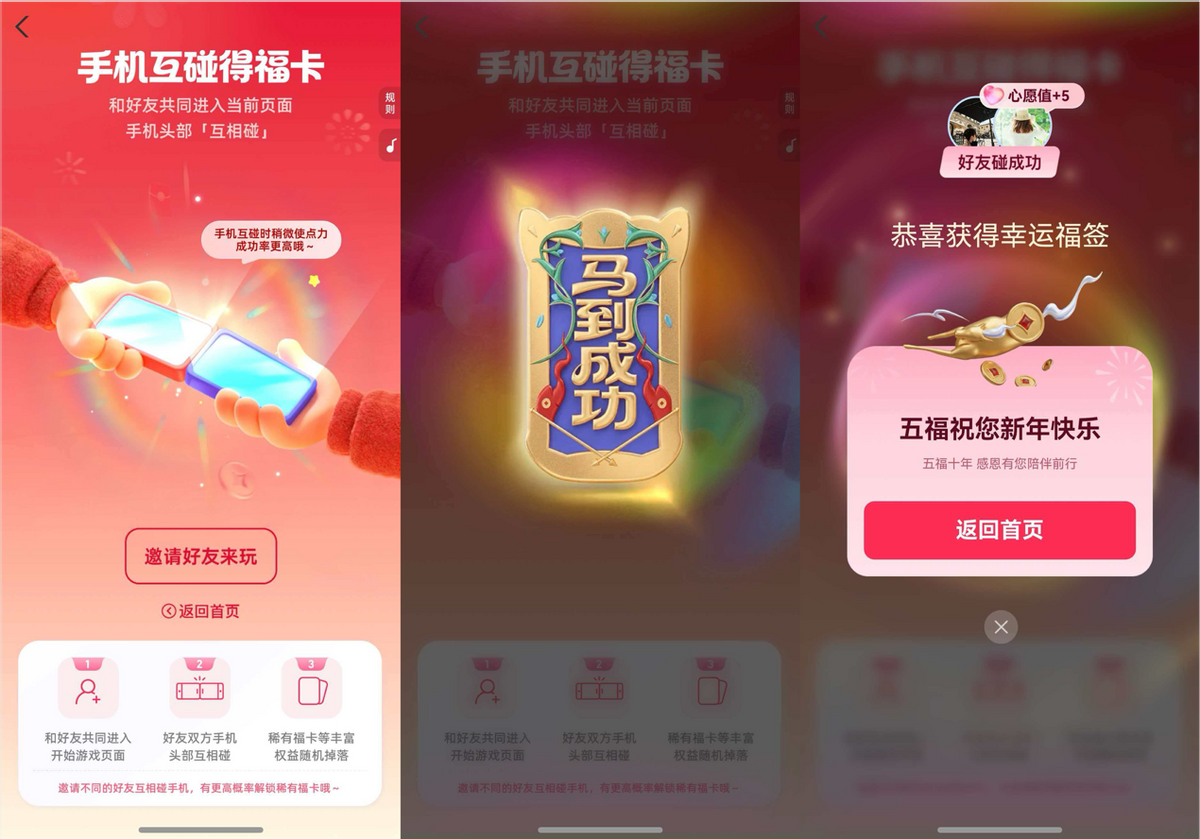 只要点击支付宝首页的福卡活动——下方心愿聚福——下方好友碰一下,和家人好友同时进入游戏,就能解锁这种新奇体验。以前是群里发链接,今年是面对面“碰”一下,这仪式感一下子就上来了。