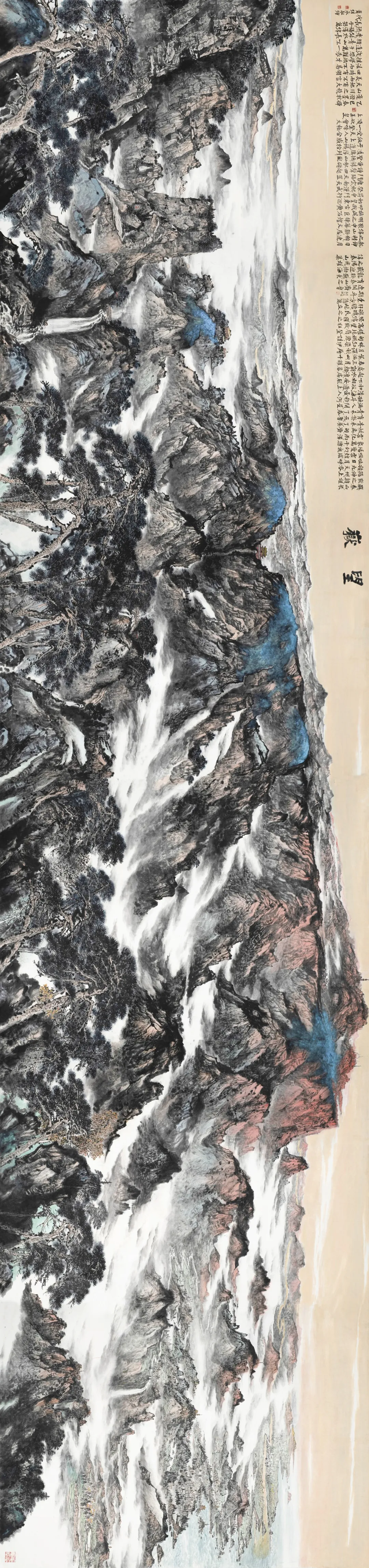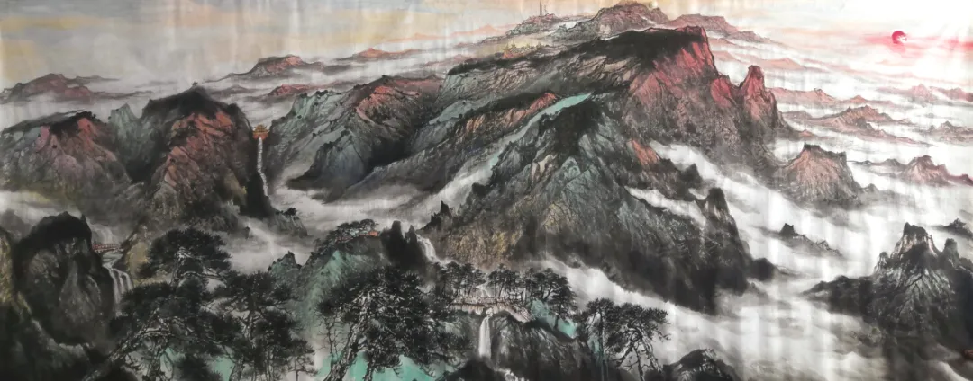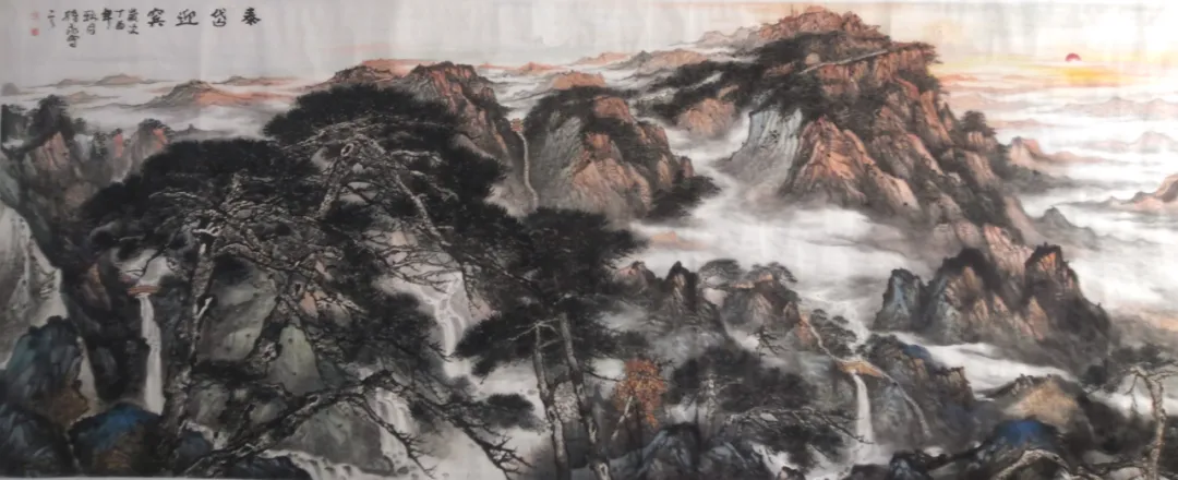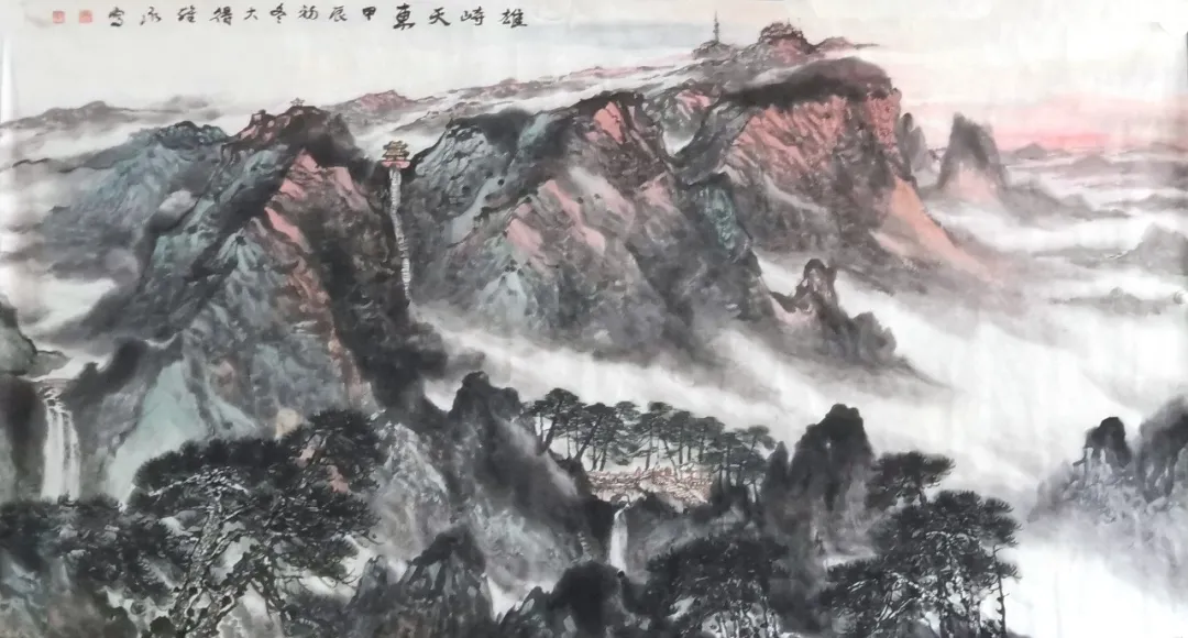 在当代中国山水画的创新脉络中,萧维永先生以八十高龄创作的《望岳》巨制(12米×3米),以其恢弘的尺幅与深邃的意境,成为一场自然与心灵对话的艺术盛宴。这幅作品不仅是对泰山意象的再现,更是对民族山水美学的当代重构,展现出超越时空的文化气度。