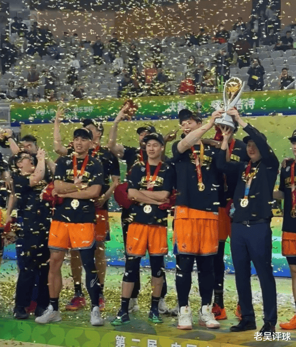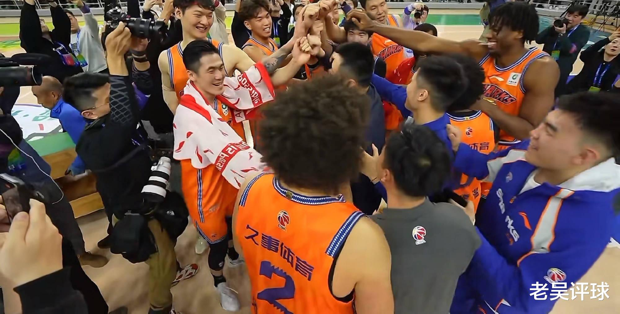上海男篮夺冠后疯狂庆祝,球员都围在一起,把卢伟指导站在最中间,一起庆祝。