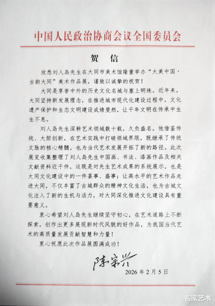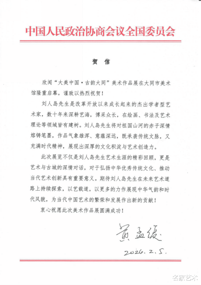 2026年2月8日上午10点,“大美中国·古韵大同——刘人岛美术作品展”在山西大同市美术馆隆重开幕。第十届、十一届全国政协副主席、中国人权发展基金会理事会原理事长黄孟复,第十一届全国政协副主席、农工党中央原常务副主席、中国生态文明研究与促进会原会长陈宗兴为展览的举办专程发来贺信。