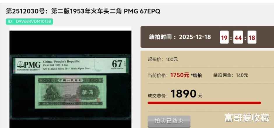 在2025年12月18日的“现代钱币拍卖会”中,一张PMG评级67分(带EPQ),1953年的“火车头2角”,最后拍出了1890元。